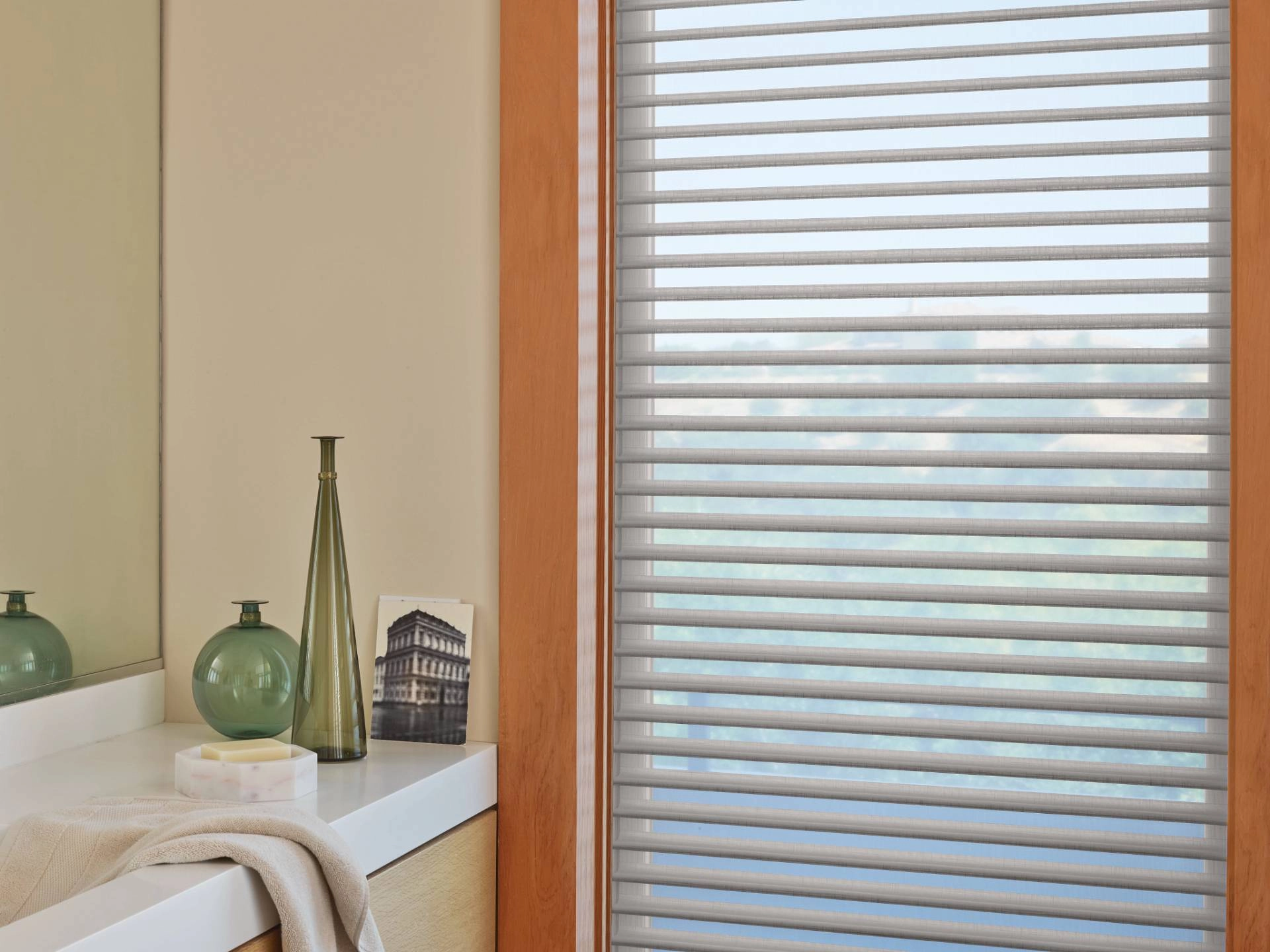 During the day, consider custom sheer shades like Hunter Douglas Silhouette® Sheer Shades to make the most of sunlight by diffusing it throughout a room to create a soft, pleasant glow. With their opaque vanes sandwiched between sheer panels, you can take full advantage of light in a small space or rotate the vanes closed to enjoy privacy when you need it.